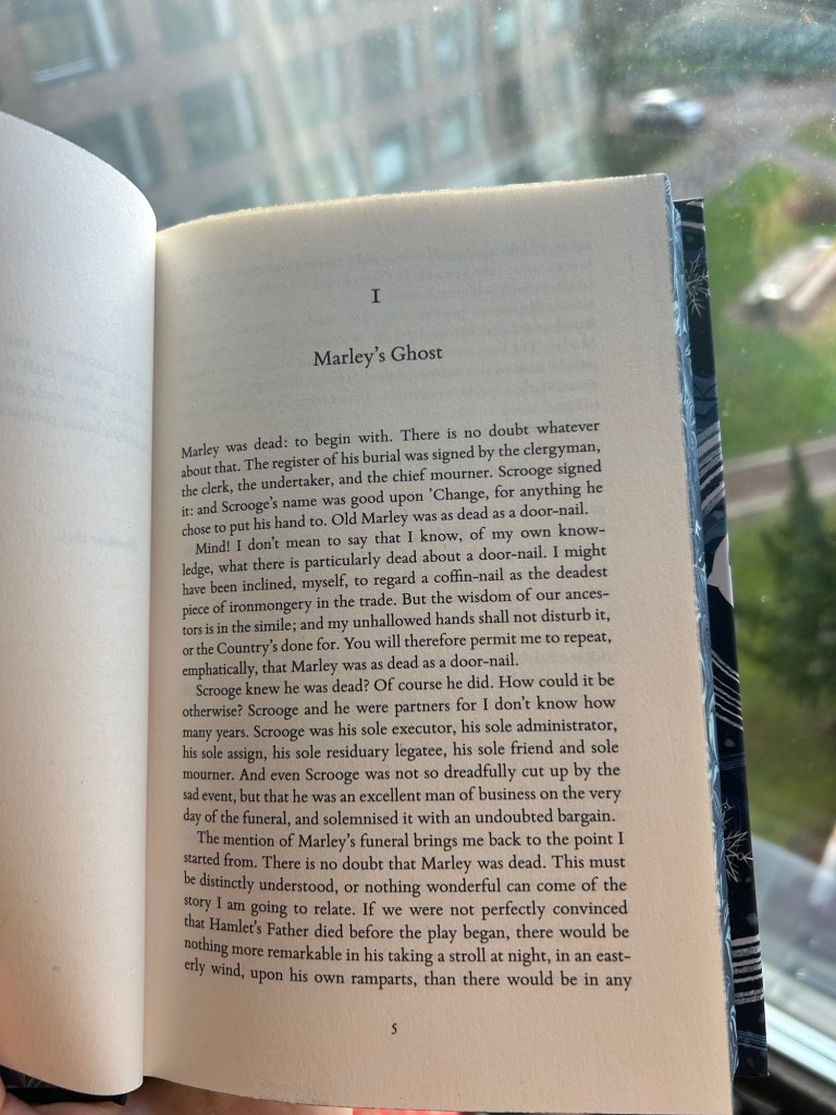 December månad är kommen och en riktig julklassiker från 1843 är i andan läst! En kortroman på drygt 80 sidor som man läser på bara ett par timmar. För ett år sedan introducerades jag för detta verk – tack vara Novellix novellkalender, som försåg mig med en novell varje dag fram till julafton, där jag läste de två sista kapitlena i den utgåvan. Nu är boken läst på engelska, från pärm till pärm, i sin helhet.