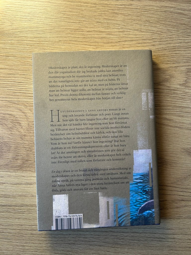 Att läsa En dag i öknen är som att läsa innerliga anteckningar från tiden som gravid, om tiden som småbarnsförälder. Titeln kan direkt tolkas som att moderskapet är som att befinna sig i en torr öken, vilket var därför det var något av en besvikelse att den inte utspelade sig under en och samma dag, utan att den i stället sträcker sig över flera år där samma tankar hela tiden ställs mot varandra. Men ändå var det en underhållande och samtidigt viktig bok att läsa, då den på inget sätt glorifierar eller romantiserar moderskapet, som så många på sociala medier kan komma att göra. Axfors bild säger inte hela sanningen om moderskapet, om vad det innebär att vara en förälder och ansvara för ett litet barn, och även om detta bara är en sida av myntet och det finns andra mer lättsamma erfarenheter, får man tacka Axfors för denna autofiktiva roman, där hon gestaltar en tillvaro som är långt ifrån glamorös, denna dikotomi mellan fantasi och verklighet, som hon uttrycker det, som genomsyrar hela moderskapet från början till slut.